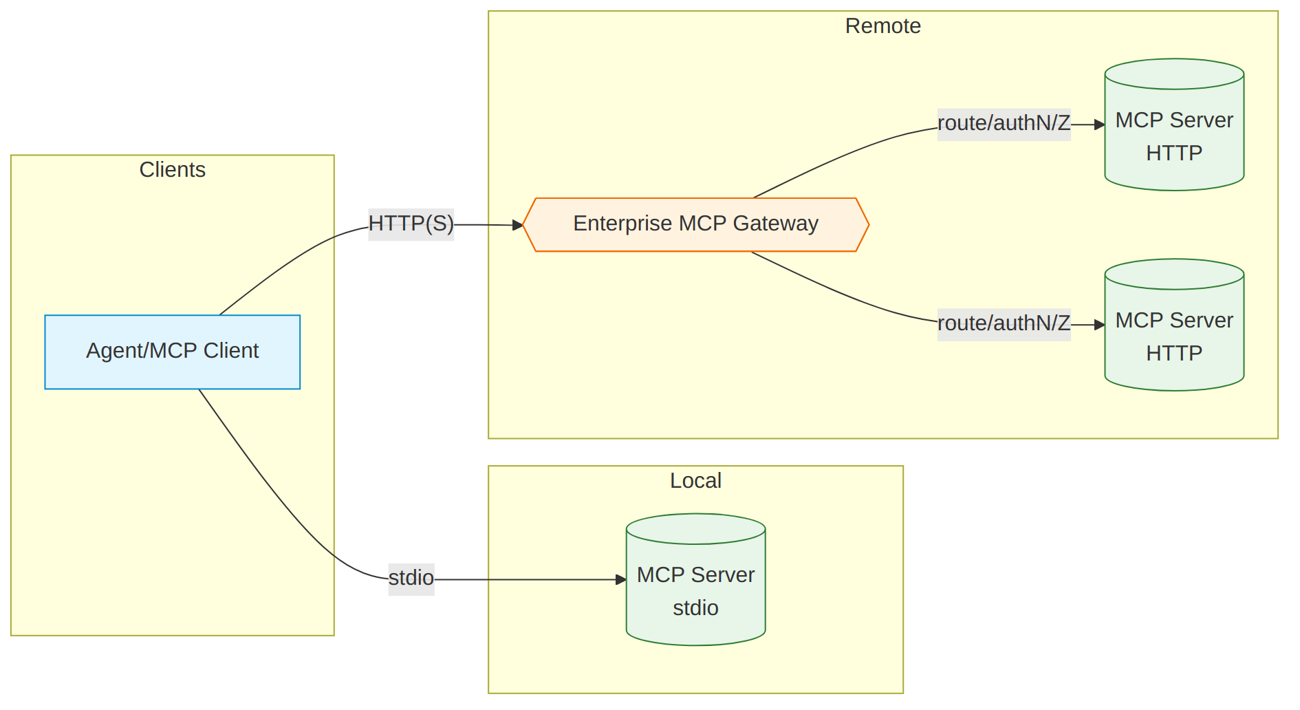 - Hybrid: Local servers for personal context + remote servers for enterprise systems, mediated by a gateway for unified policy.